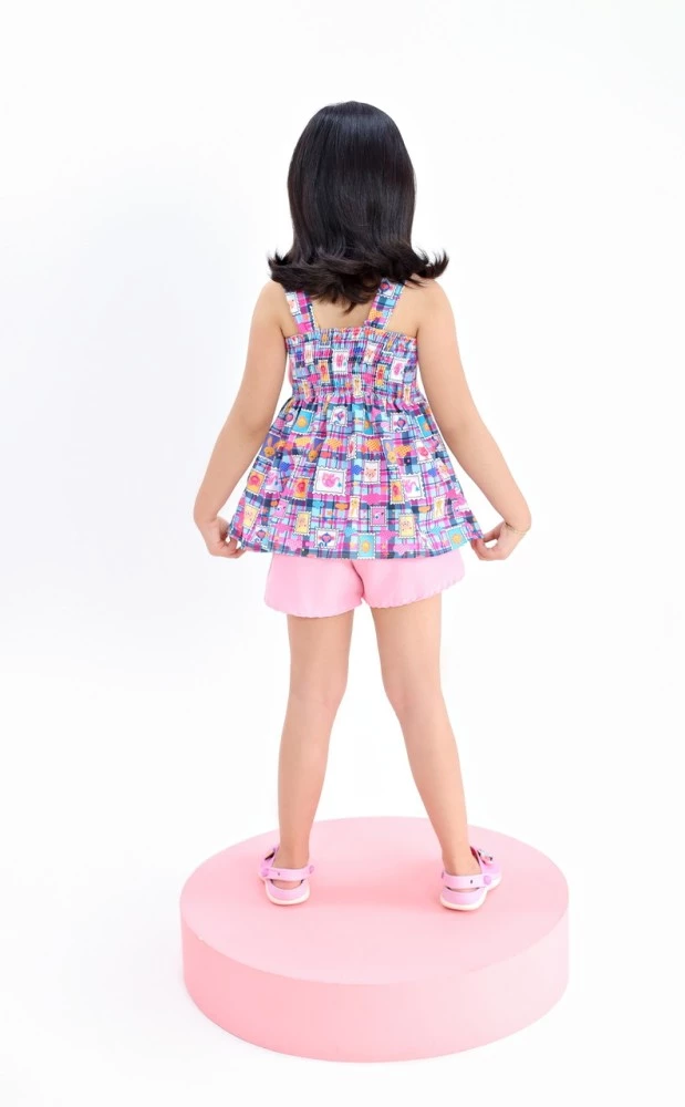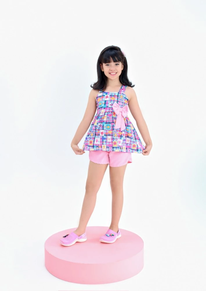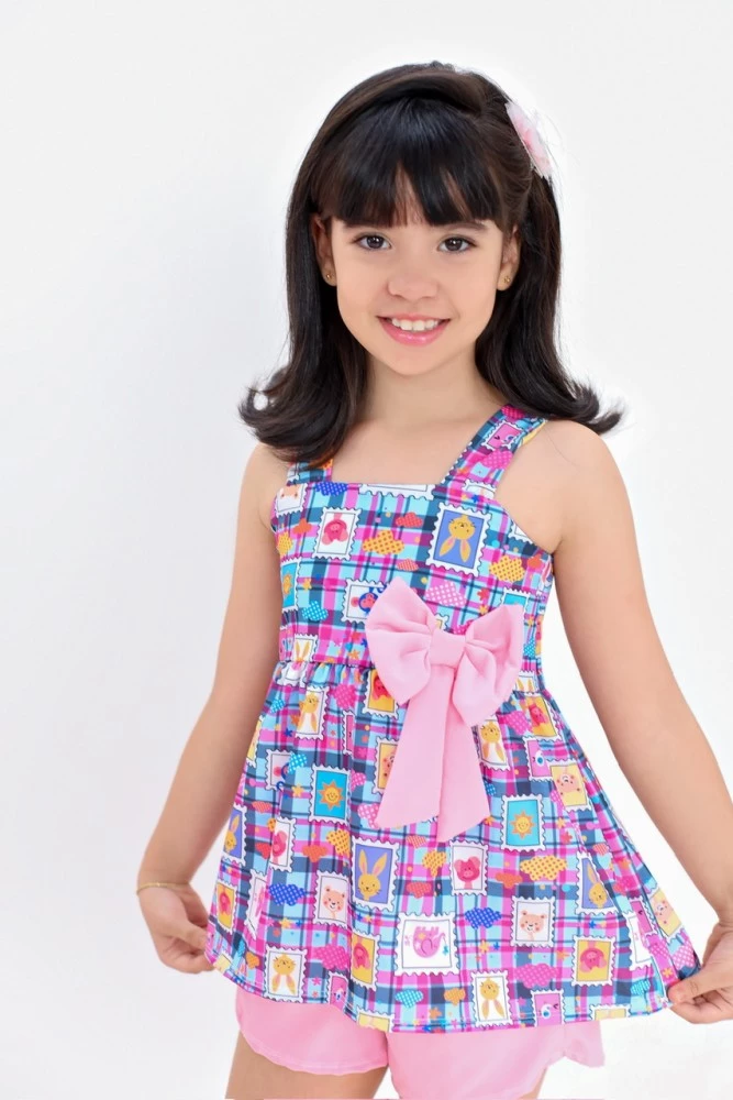 A blusinha conta com alças largas, que oferecem mais segurança e conforto, além do detalhe encantador do laço com pala, que traz ainda mais charme para a peça. O short possui lastex na cintura, garantindo um caimento perfeito e liberdade nos movimentos, deixando sua pequena à vontade para brincar e se divertir.